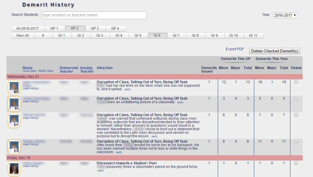 8. Admin Dashboard - Top 20 Demerit Earners: If Demeritus is used, the top 20 demerit earning studenst are displayed on the administration dashboard. Within days of the start of the school, administrators can identify those students who will need intervention strategies in order to have a successful year. The progress of the students' behavior can then be monitored easily and closely on a daily basis.